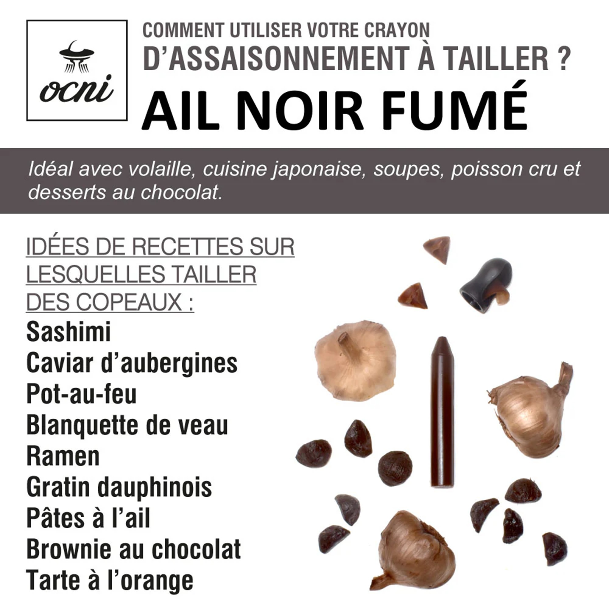 Le crayon Ail noir fumé est idéal une cuisine japonaise, soupes, poisson cru et desserts au chocolat.